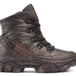 Эффектные ботинки стилизованы винтажными фактурами и бронзовыми оттенками. Прочный текстиль с водоотталкивающей и ветрозащитной мембраной BIOMETEX, утепленная подкладка и шерстяная стелька обеспечат комфорт в любую погоду от +5 до -15 градусов. Инновационная полимерная подошва CLYDE с рельефом против скольжения