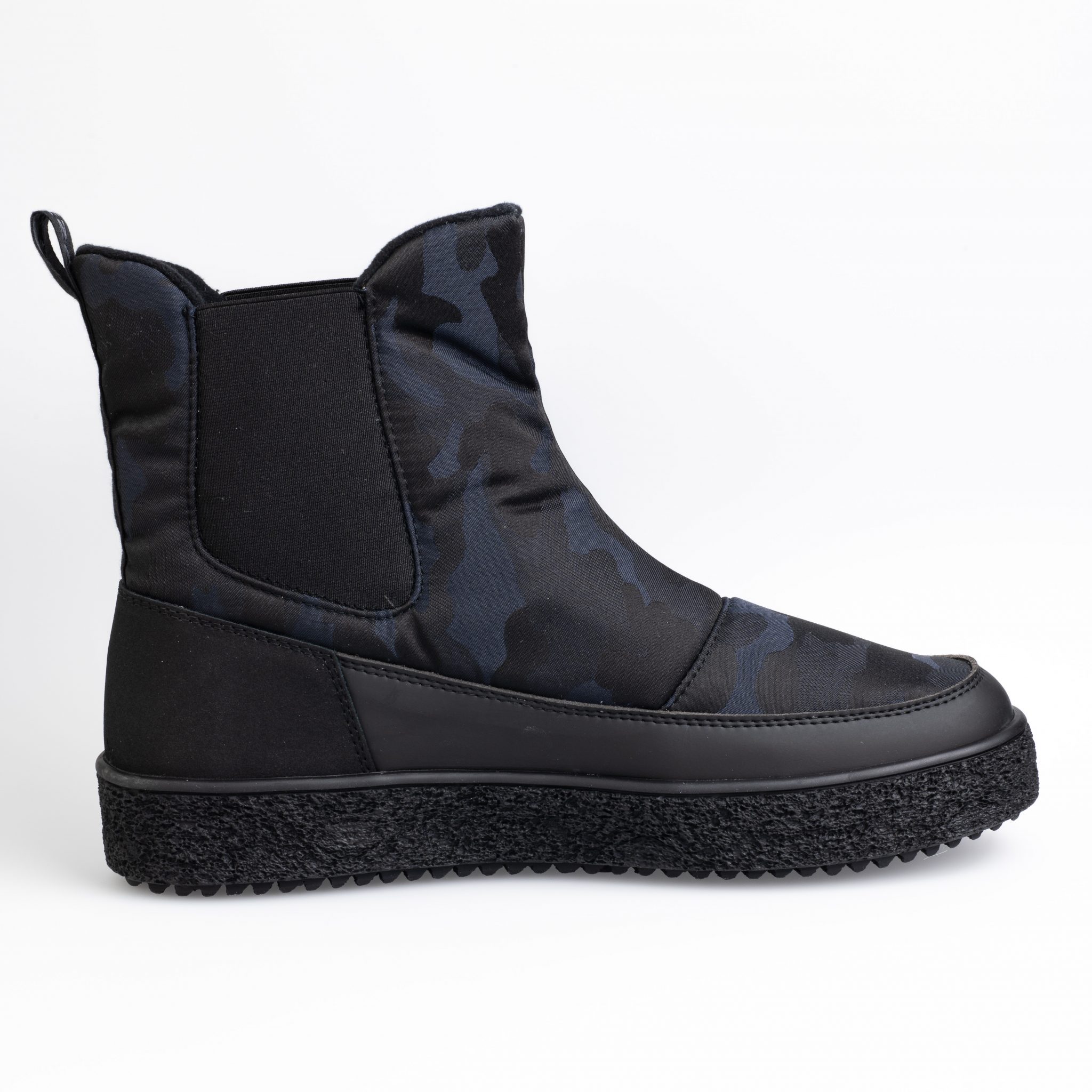 В темно-синих челси на широкой, но легкой подошве с рифленым протектором ногам будет комфортно в прохладное межсезонье. Модель из прочного текстиля с камуфляжным мотивом и гладкого полиуретана, стилизованного под матовую кожу, не промокает и не продувается ветром, а внутренняя отделка хорошо удерживает тепло. Фигурное голенище с характерными эластичными вставками по бокам дополнили петлей сзади