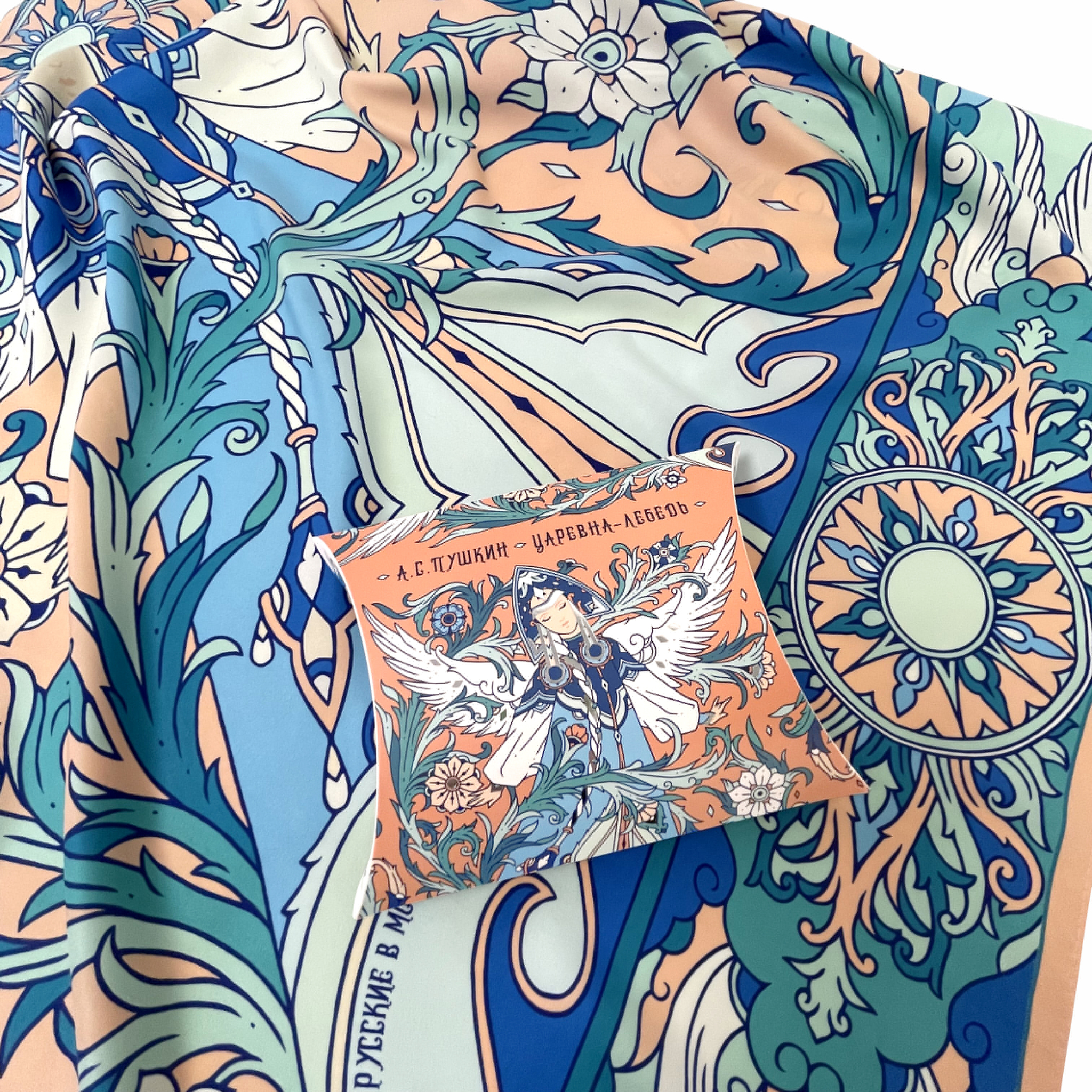 Нежная и освежающая цветовая гамма этого шелкового аксессуара в эксклюзивной подарочной упаковке — прекрасный подарок себе и любимым Дизайнерский платок “Царевна-лебедь” — воплощение сказочного персонажа, прославленного А. С. Пушкиным. В центре композиции — удивительной красоты женщина с белоснежными крыльями, наделенная магическими способностями и житейской мудростью. Оригинальное сочетание тонов, цветочных орнаментов и сказочного колорита делают аксессуар самобытным. Он станет изысканным и деликатным дополнением как повседневного, так и вечернего образа утонченной леди. Состав: шелк 70%/вискоза 30%, размер: 90*90 см