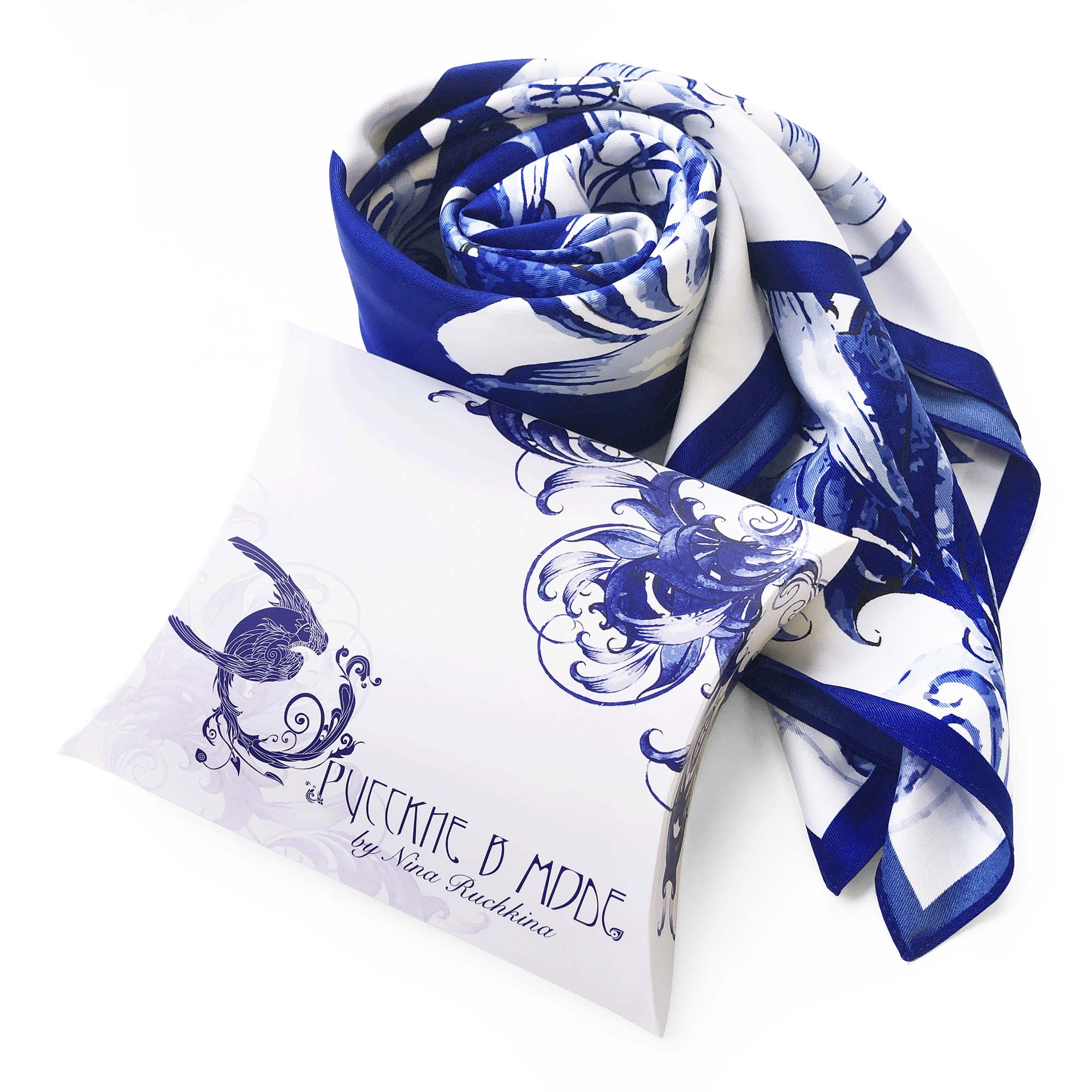 Нежные, добрые, волшебные сине-голубые платки в стиле «Гжель» by NINA RUCHKINA — это изысканный, универсальный аксессуар и беспроигрышный подарок! Размер 90*90 Состав: шелк 70%, вискоза 30%, шелкография. Материал исключительно приятный на ощупь и неприхотливый в уходе Изделия предлагаются в эксклюзивной подарочной упаковке.