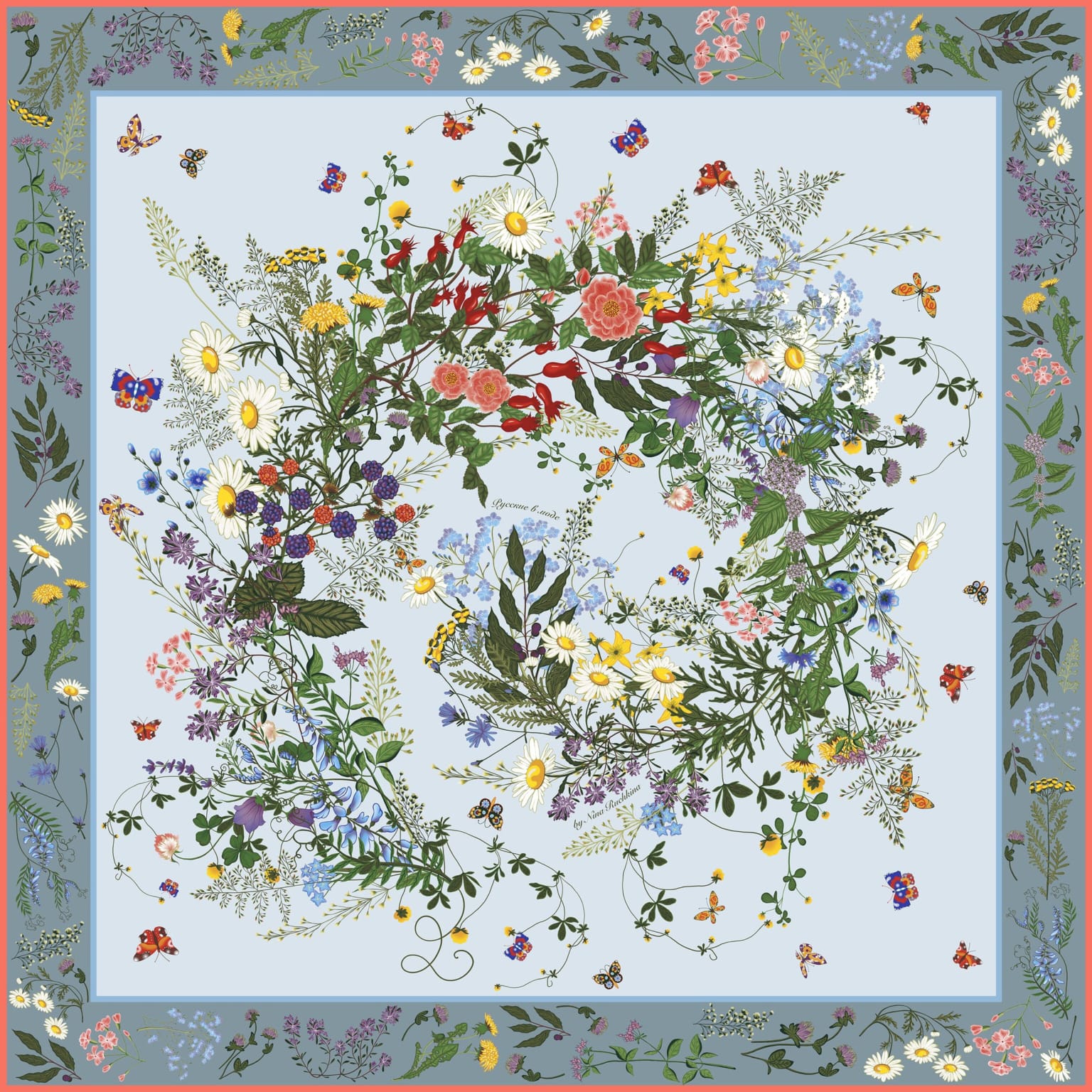 Яркое благоухающее разноцветье полевого букета воплощено в дизайнерском шелковом платке: Чудесные незабудки и ромашки, нежные васильки, пышный клевер образуют полукруг венка с вплетенными листьями лавра, чабреца, мяты. Нежный пастельный тон фона создает ощущение простора и воздуха, а окантовка делает драпировку платка особенно эффектной. Платок «Русский полевой букет» — это выражение любви, олицетворение изящества и источник радости! Состав: 100% шёлк Размер: 90*90 см Ручная обработка края Изделия предлагаются в эксклюзивной подарочной упаковке