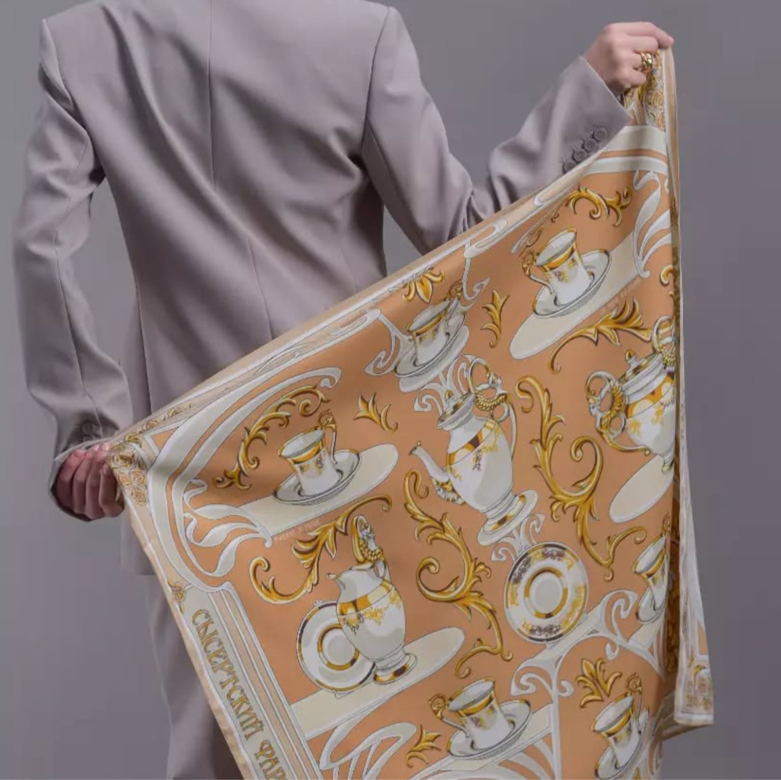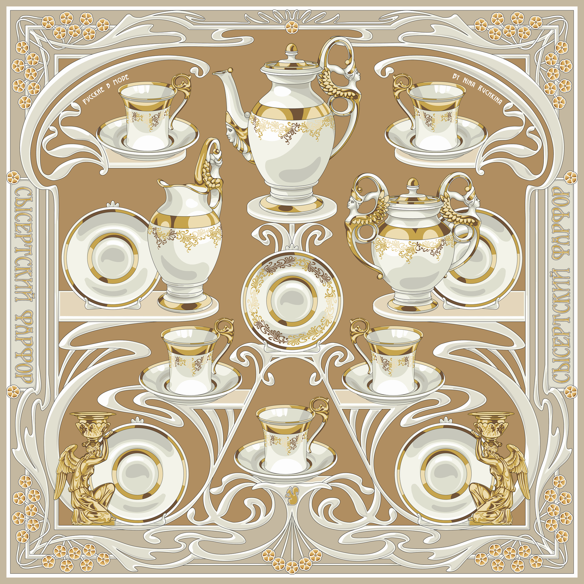 Дизайн платка «Сысертский фарфор» посвящается известному уральскому народному промыслу, впитавшему декоративность и символизм многоликого модерна. Композиция платка словно сказочный лабиринт вовлекает в детали утонченного сервиза. Изящные фарфоровые предметы расположены в ажурном серванте эпохи модерна. Сочетания благородного золота и слоновой кости, плавные линии и стилизованные цветы рождают необычайно элегантный дизайн авторского аксессуара. Такой платок привнесет художественный шик как в базовый гардероб, так и в вечерний стиль. Состав: 70% шёлк/30% вискоза Размер: 90*90 см Изделия предлагаются в эксклюзивной подарочной упаковке