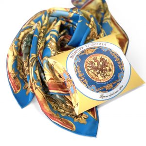 Дизайн посвящён одному из самых известных в мире интерьеров – Янтарной комнате Екатерининского дворца музея-заповедника «Царское Село», которую часто называют восьмым чудом света. В композицию платка включены стилизованные фрагменты ее интерьера: художественные росписи плафона, мозаичные янтарные панно, затейливые узоры золочёной лепнины. Благородное сочетание царственного небесно-синего и яркого золотого цветов привлекает внимание, придаёт образам с этим аксессуаром завершенность и гармоничное звучание. Состав: шелк 70%/вискоза 30%, 90*90 см. шелкография Изделия предлагаются в эксклюзивной подарочной упаковке
