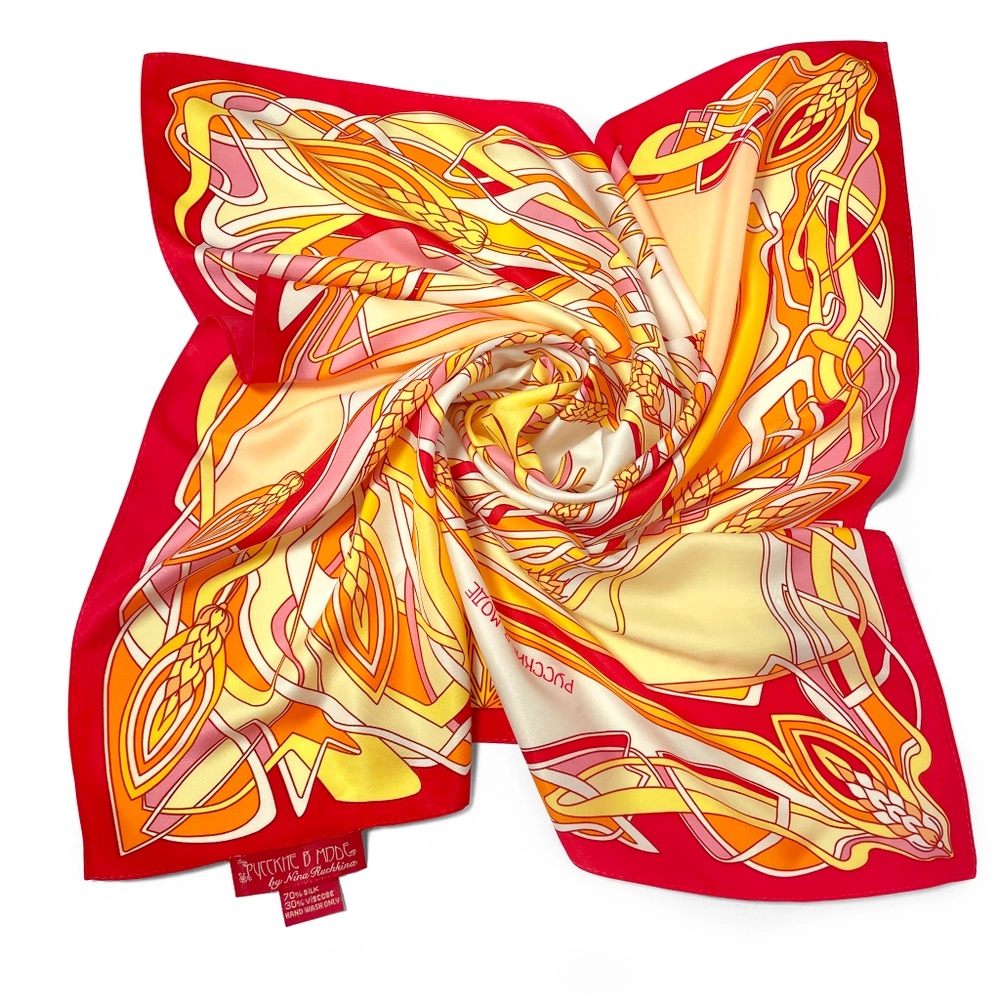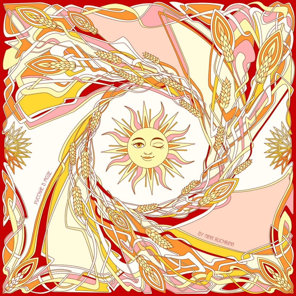 Дизайн этого шейного платка в стиле модерн завораживает волшебством линий, а улыбчивое Светило в центре композиции дарит миру тепло. Солнце и колосья — символы урожая и процветания, изобилия и исполнения желаний Размеры: 65*65 см Состав: вискоза 30%, шелк 70% Материал исключительно приятный на ощупь и неприхотливый в уходе Изделия предлагаются в эксклюзивной подарочной упаковке.